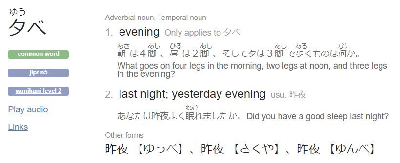 It was confusing to me because the vocab entry is for 夕べ, but then they use 夕 in a sentence by itself. Even if it was correct in some context, why on earth would you use an example of the vocab that doesn’t reflect the actual vocab entry? I get when it happens for verb tense or something like that, but this seems different.