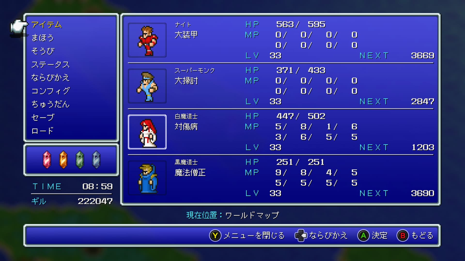 In the original Famicom game your inventory is very restricted and you have to allocate every item to a single character, so it adds some layer of compromise when you decide to hoard these magic items, but in the Pixel Remaster there are no inventory constraints and all items are shared by everybody, so itās even more overpowered.