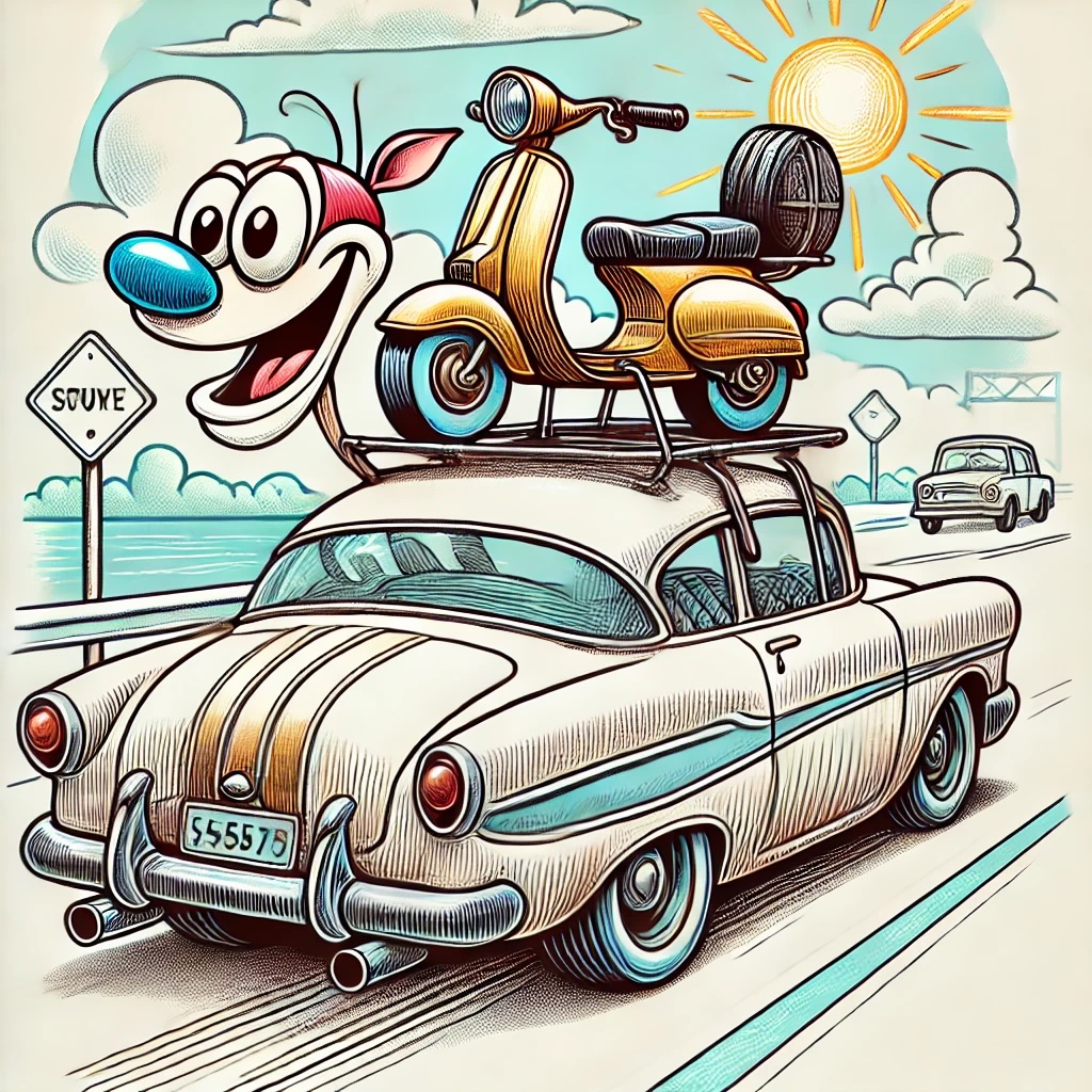 れん (from れん and Stimpy) is driving a Car with a trailer behind it so he can TAKE ALONG his Scooter.