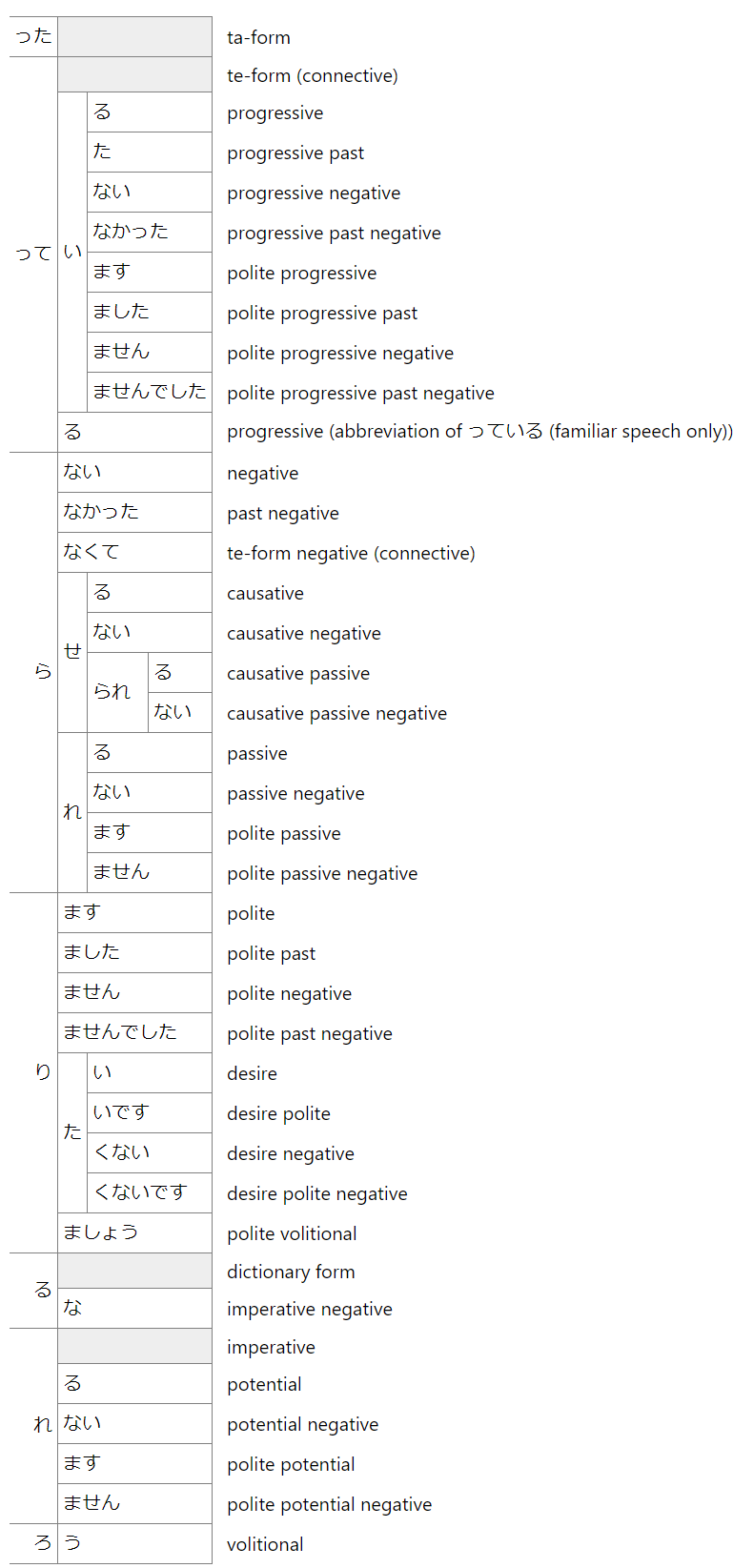 But I get a bit overwhelmed by all the things one might do. I’m thinking “hmm, sugiru, is that something I attach to a verb stem, or does it come after the te form” , and I’m wondering if anyone’s stumbled across a list that sorts everything by the kind of conjugating that happens before the next bit gets added, i.e.