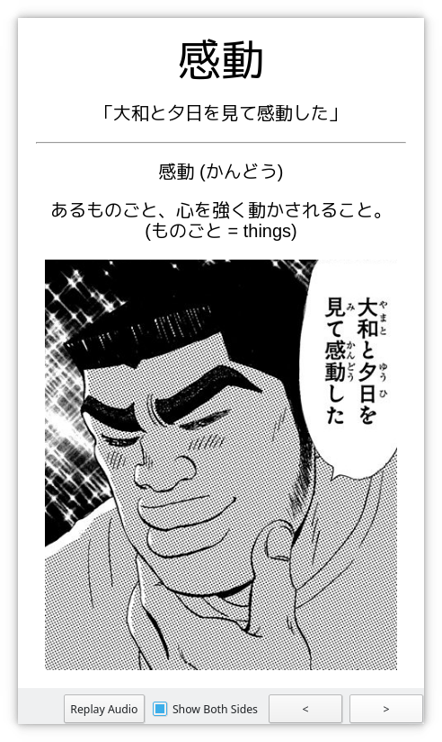 The latest thing I’m trying to see if it impacts anything is using Japanese definitions rather than English words for the meaning (in case I forget a word). For manga-sourced cards, this isn’t as necessary, because there’s typically enough context in the manga panel on the back of the card. For anime-sourced cards, it can sometimes be a bit more difficult to discern context to remember the word’s meaning.
