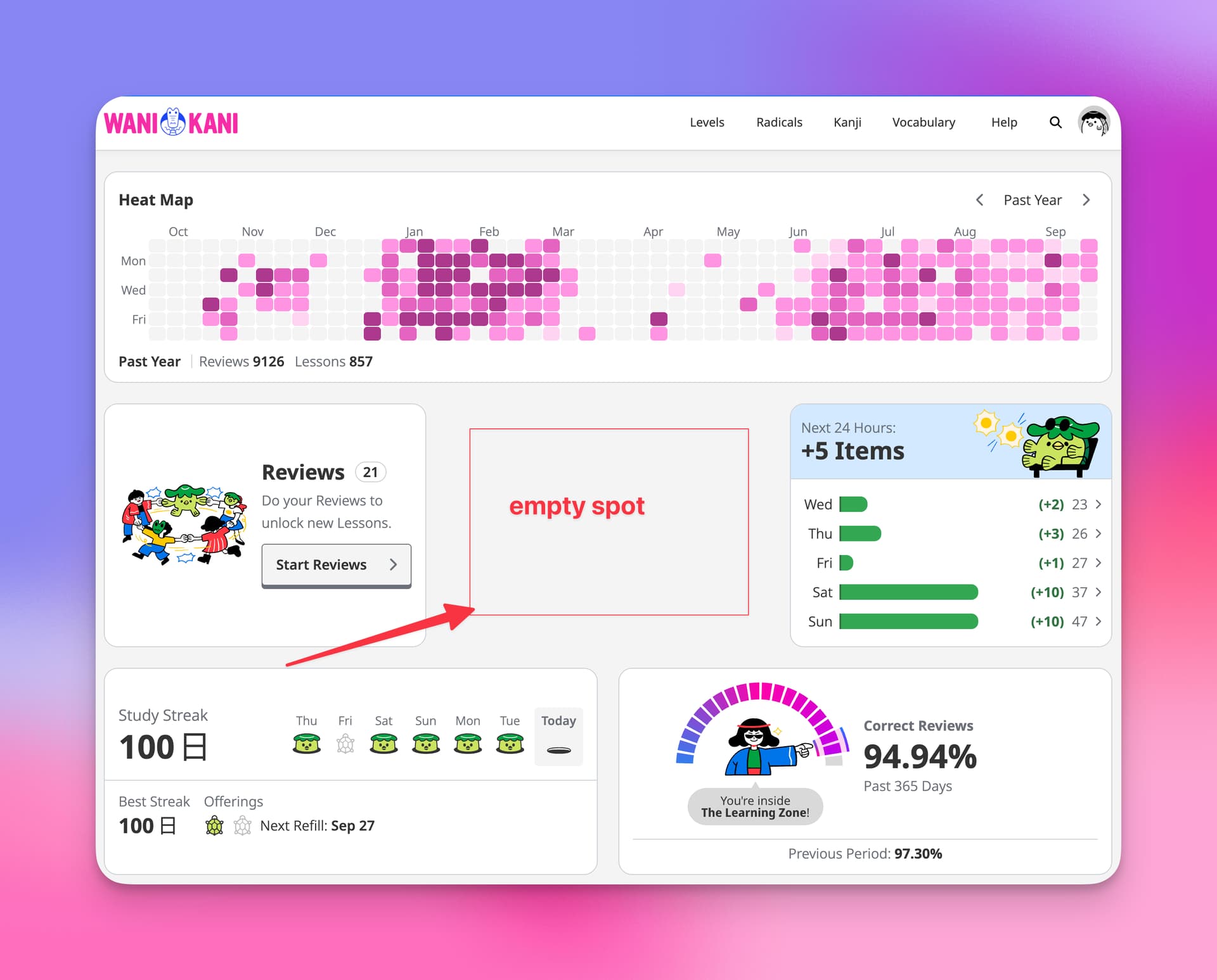 We also made sure that all the features that were on the old dashboard made it into the new dashboard, even the ones we didn’t really want to keep. But there they’ll be, and you can choose to add them to, or remove them from, your dashboard. You even have the option to keep the sacred neon blue and pink Lessons and Reviews widget colors, if you want them.