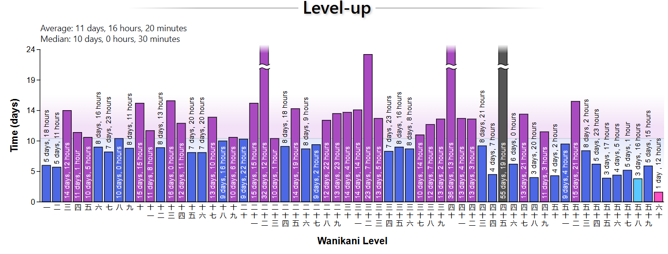 As you can see, I had three levels that extended longer than the y-axis of the display. One was after a summit at Stanford with some of my old teammates where I drank so much I couldn’t look at a review for two weeks, funny enough one was going to Japan, and for the longest level (55 days!) I was part of a long interview process for Jane Street and all my WaniKani time was replaced by LeetCode (gross)