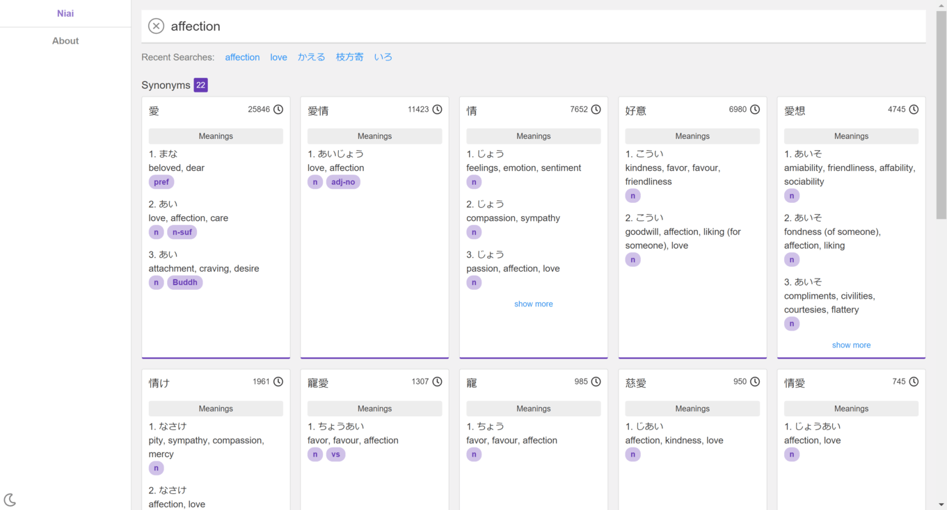 The whole thing is open sourced on github: GitHub - mrahhal/niai: Lookup similar Kanjis, Homonyms, Synonyms!. Any suggestions/contributions are very welcome!