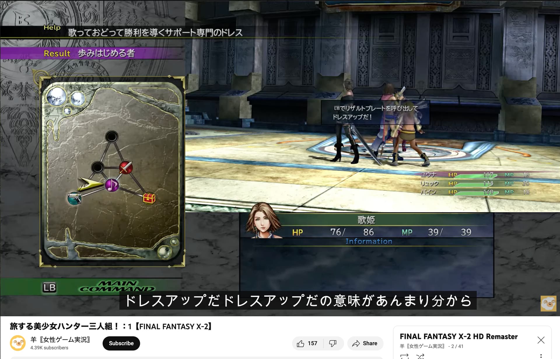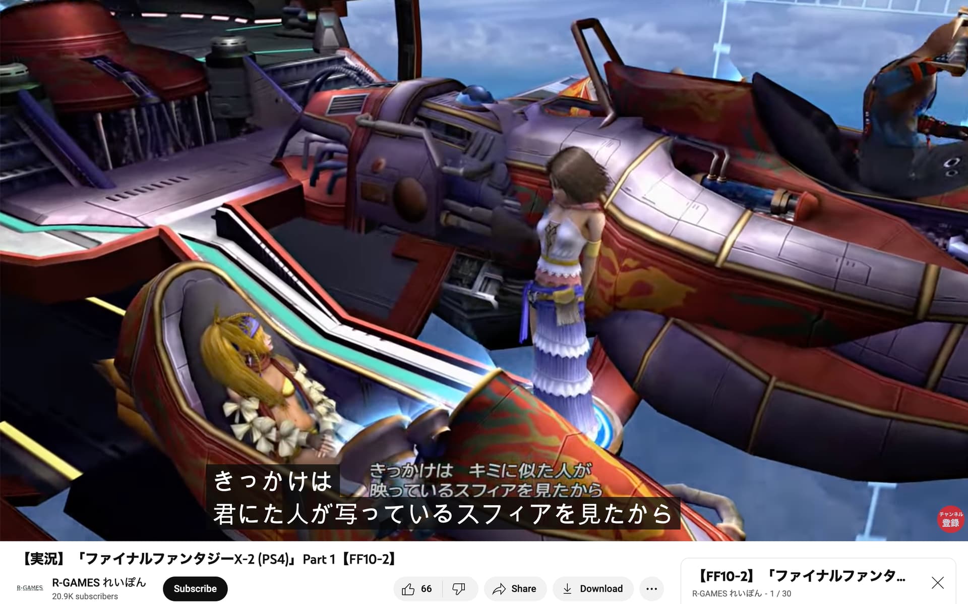 The next FFX-2 stream from Hitsuji was the proper start of the game, since she began with the Eternal Calm interlude that I watched yesterday. When I played this game as a kid, I hadn’t heard of FFX (or any Final Fantasy, really) so I played X-2 with a completely new perspective. It’s so delightful to hear Hitsuji play this game coming from FFX because I never realized how exciting it is to the player for there to be a Yuna-not-Yuna mystery in the beginning. She was absolutely losing her mind when Rikku and Paine (named リュック and パイン in Japanese - that was new info to me!) had to start fighting “Yuna” right off the bat. Sorry if this information is boring to you all, I’m having such a nice time revisiting my old favorites from the perspective of a new language ![]()