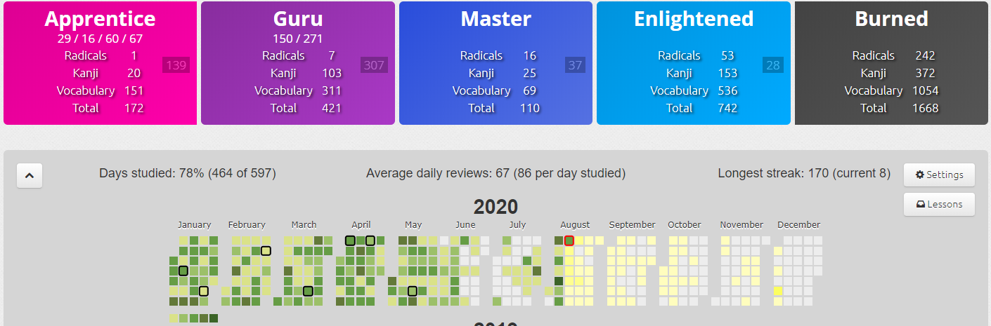 Anyway, i’ve upped my game, doing 10 lessons a day again if possible, because I need a max of 13 days per level to reach 60 before December 2021. Guru pile has shrunk significantly to around 170.