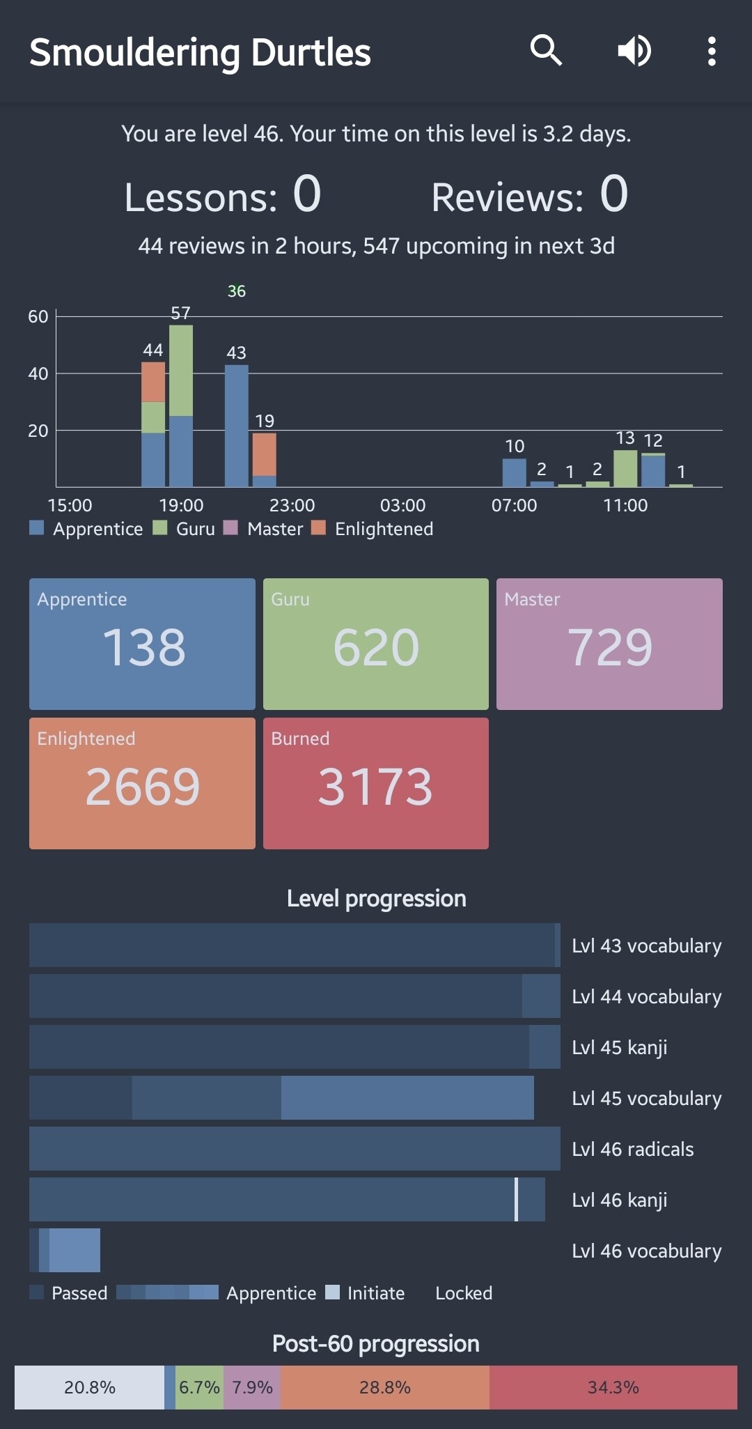 This doesn’t show it, because it’s Smouldering Durtles (maybe there’s a way and I haven’t found it yet) but over on Tsurukame it says 13h51min left so I’m 0/0 within 24 hours of level up.