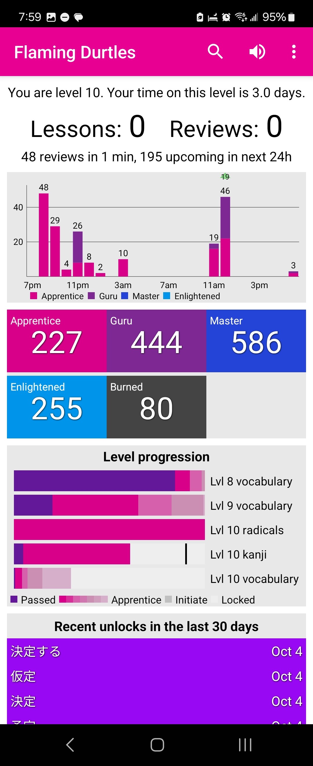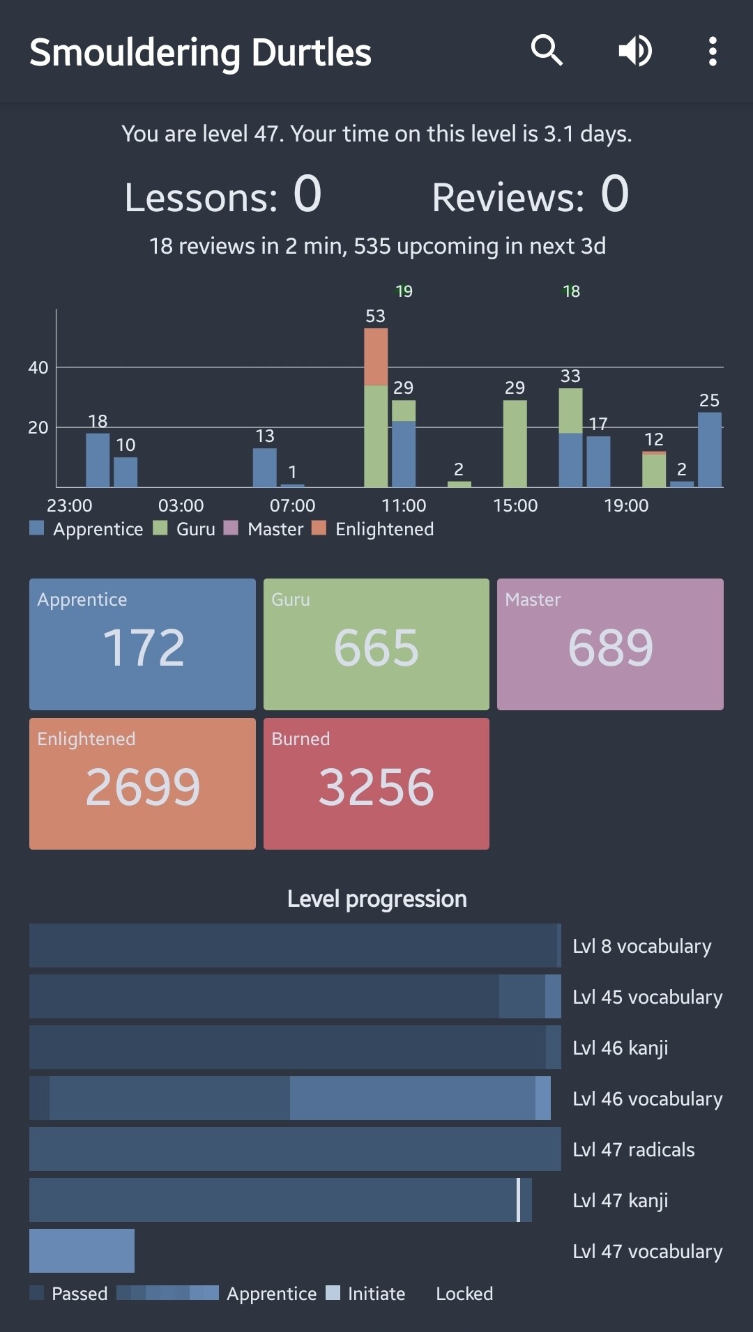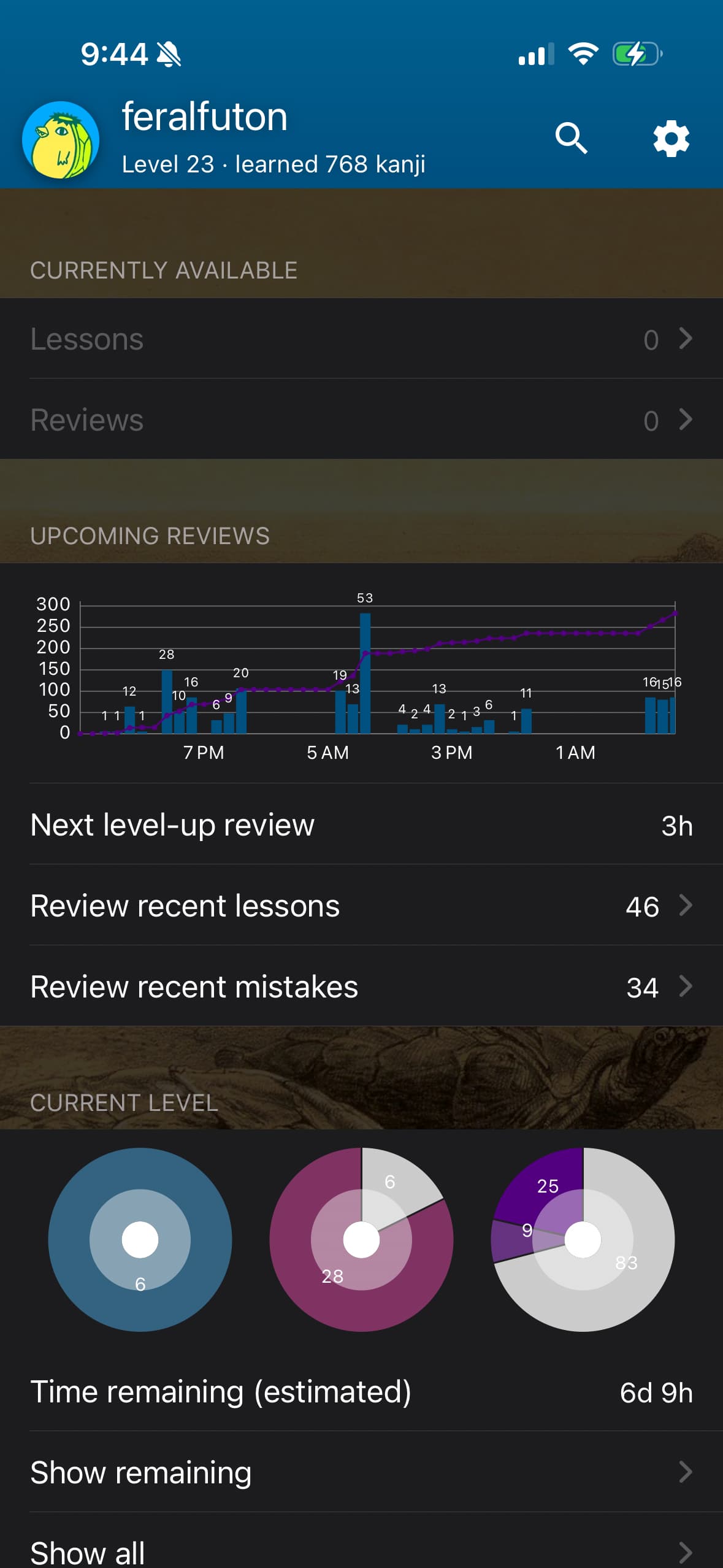 Got back to 0 reviews 2 days ago. Took the lessons to 0 too today, forecasting durtle seems a bit worried. But I’m happy to be back on the WK train!