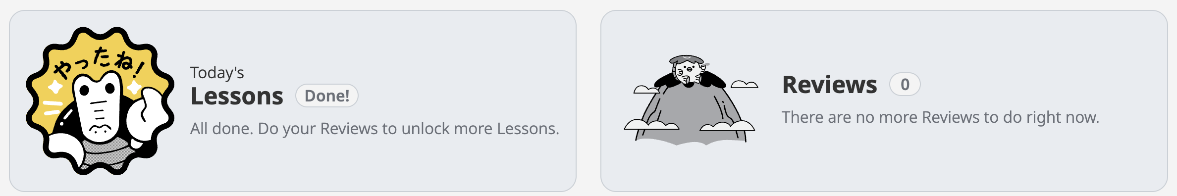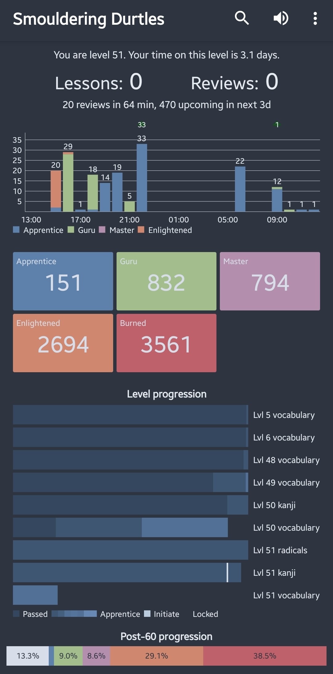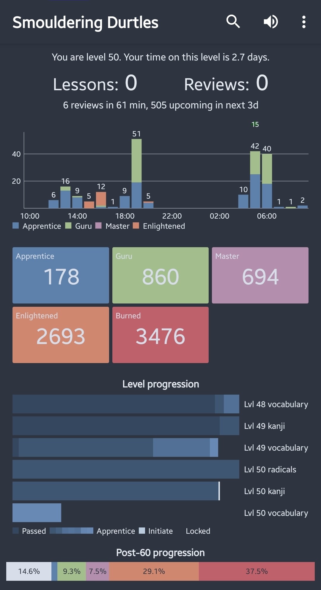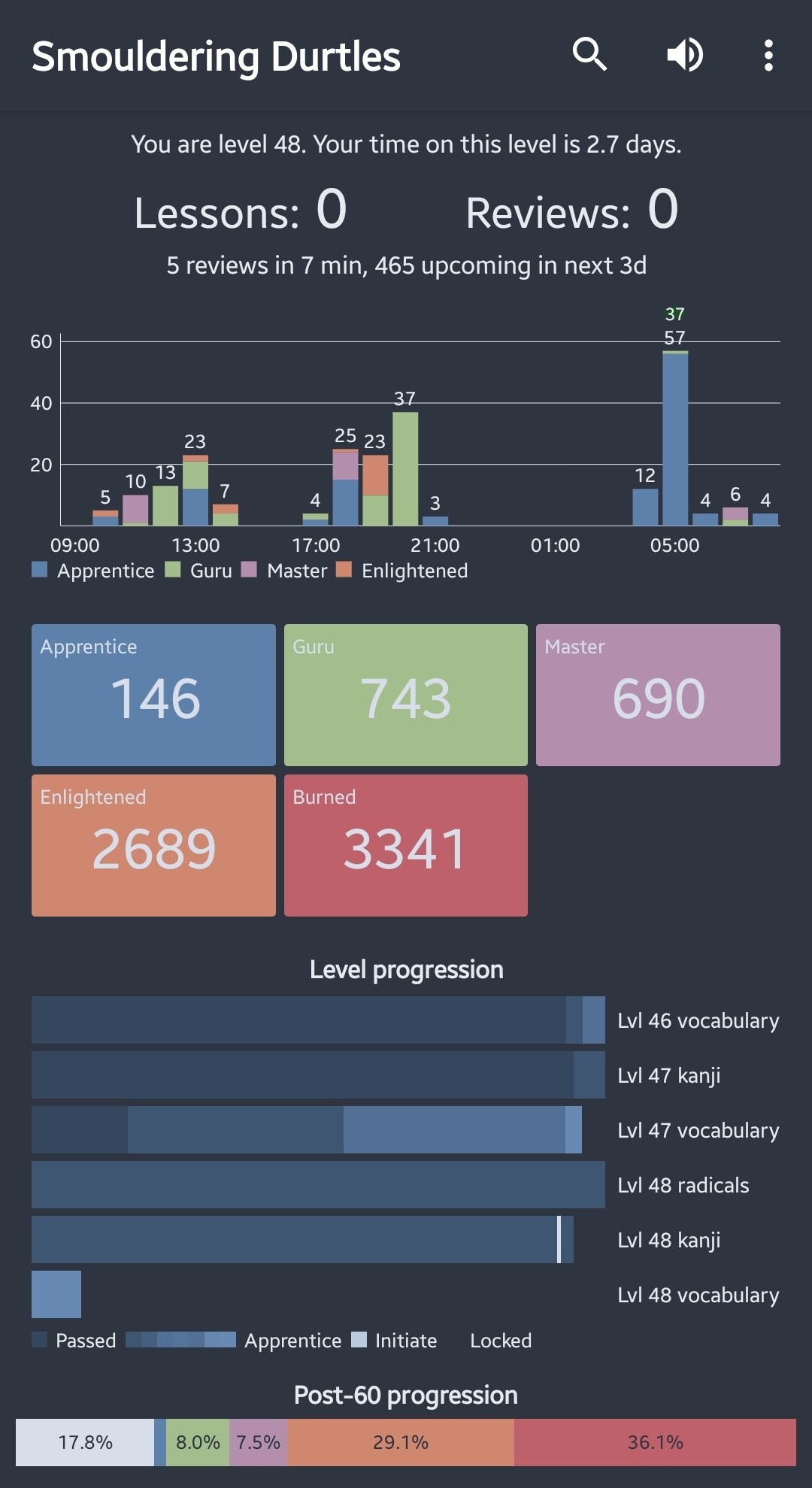 Got back to 0 reviews 2 days ago. Took the lessons to 0 too today, forecasting durtle seems a bit worried. But I’m happy to be back on the WK train!