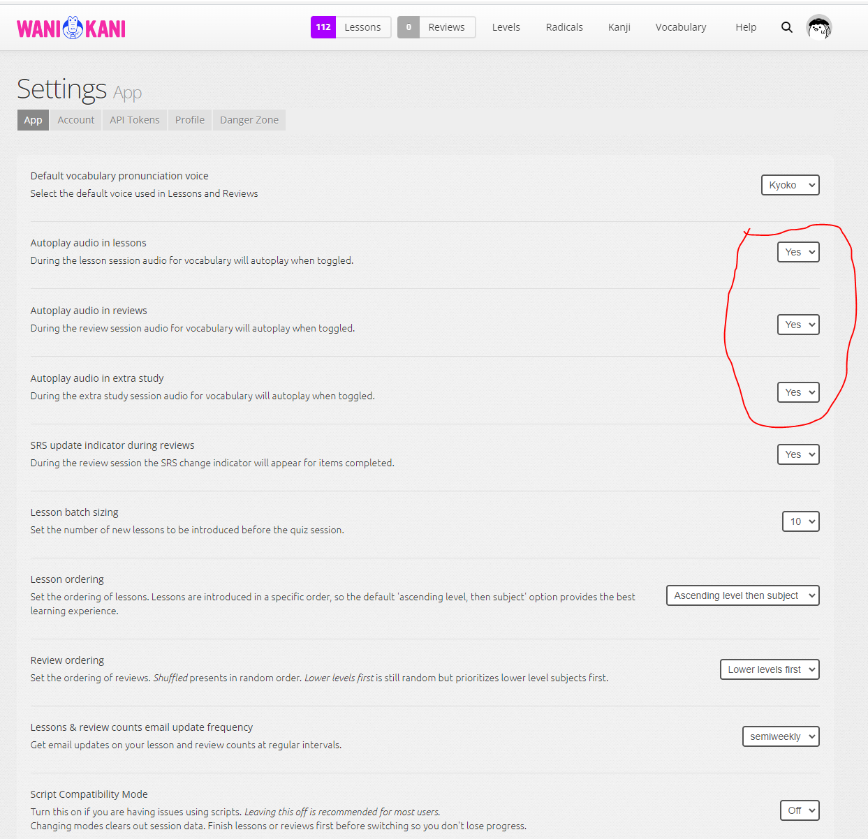 When I have audio On in Anki mode and set to No in âAutoplay audio in Lessonsâ in WK, I still donât hear the audio. When I set it On in Anki and Yes in âAutoplay in lessonsâ I hear the audio double.