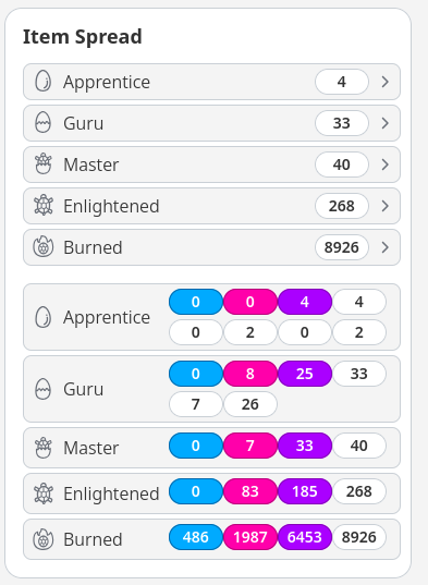 For the record, things look mostly good with Breeze Dark 2, aside from the browser default style of the inputs (I’ll see if I can make use of wanikani native classes/styling for inputs to make them seem better). Oh and maybe I’ll experiment with how borders look. Not sure if I want with or without on this table. As a side note, this popup made me realize my item color choices are a bit too bright for my background color 2, I’ll need to adjust that.