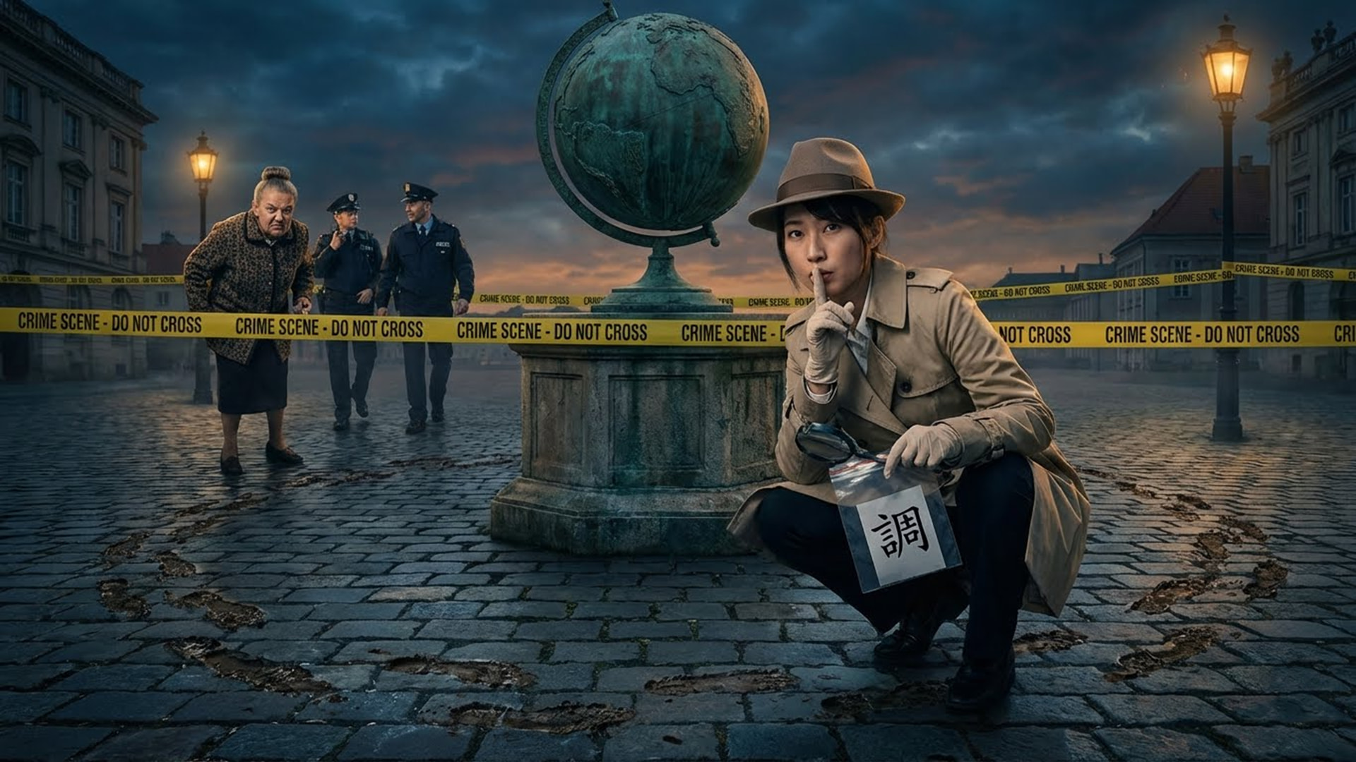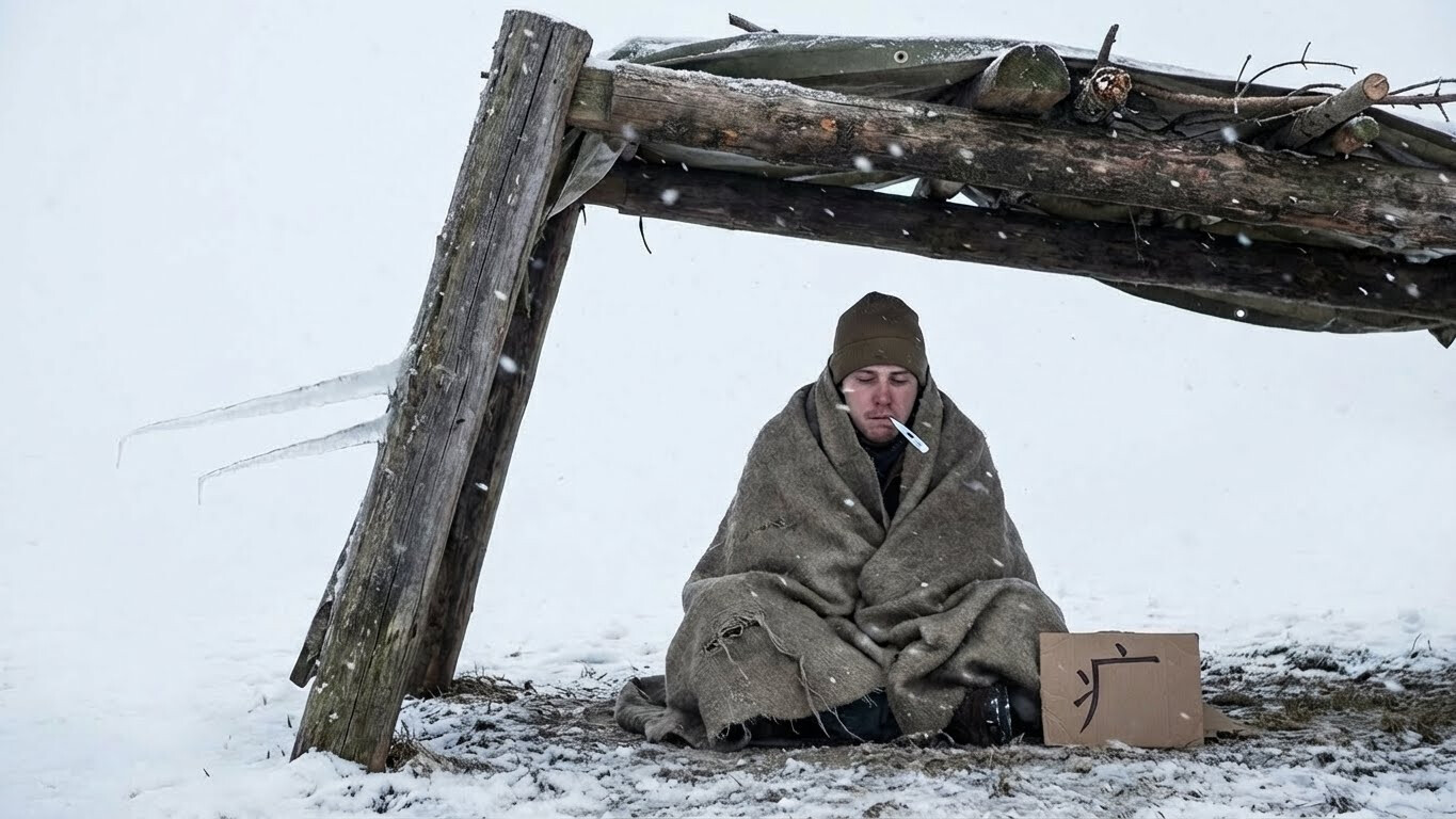 inside a high-end, luxury restaurant with polished marble floors. A wealthy, snobbish customer in a tuxedo is standing and pointing arrogantly at a spilled glass of water on the floor and stares at the waiter, demanding that he cleans it. A waiter looks humiliated, kneeling on the ground and attempting to clean the water spill using a fresh green cucumber instead of a towel. The cucumber has a produce sticker on it that clearly displays the black kanji character 求.