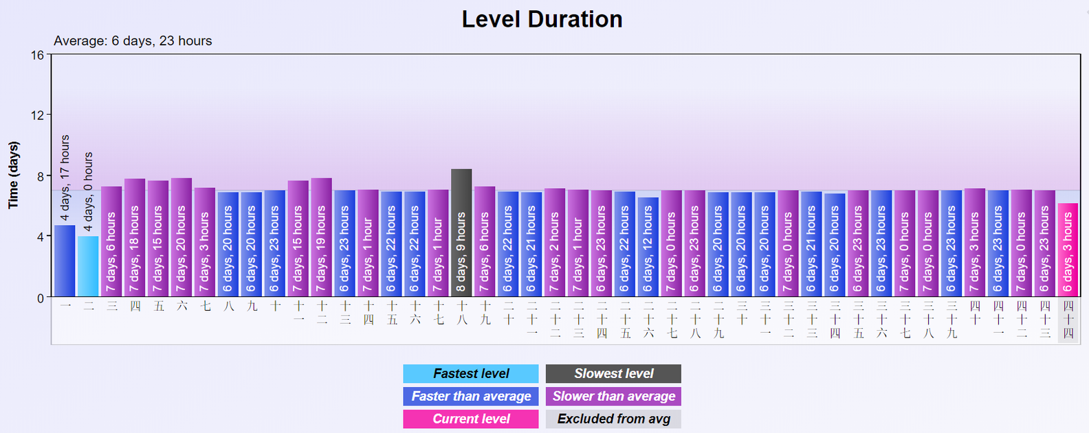 Level 4 was my slowest. Besides level 3 that was my only level over 9 days. And levels 5 and 8 were my only levels over 8 days.